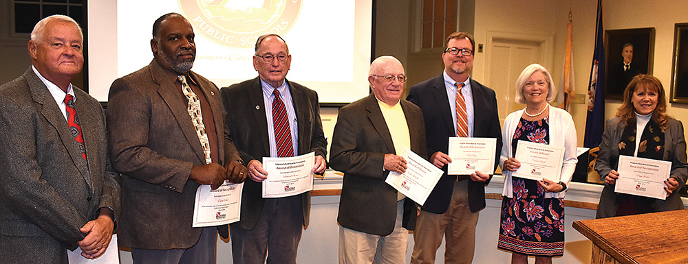 The Middlesex County School Board and school officials were honored Monday night at the school board meeting by the Virginia State Boards Association with “Awards of Distinction” for participating in various state workshops and programs over the year. Pictured above are, from left, Pinetop District board member Garland Harrow, Jamaica District board member Elliott Reed, Saluda District board member Dr. Richard Shores, Hartfield District board member Jim Goforth, Middlesex School Superintendent Dr. Peter Gretz, school board chair and Harmony Village board member Claudia Soucek, and executive assistant to the superintendent and clerk of the school board Peggy Jordan. (Photo by Larry Chowning)