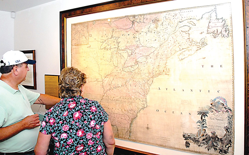 Also on display is the rare 1755 John Mitchell Map, one of the earliest maps of the original 13 colonies. It was used to negotiate the treaties between Britain and the United States that ended the Revolutionary War. The map was recently restored and fills an entire wall.